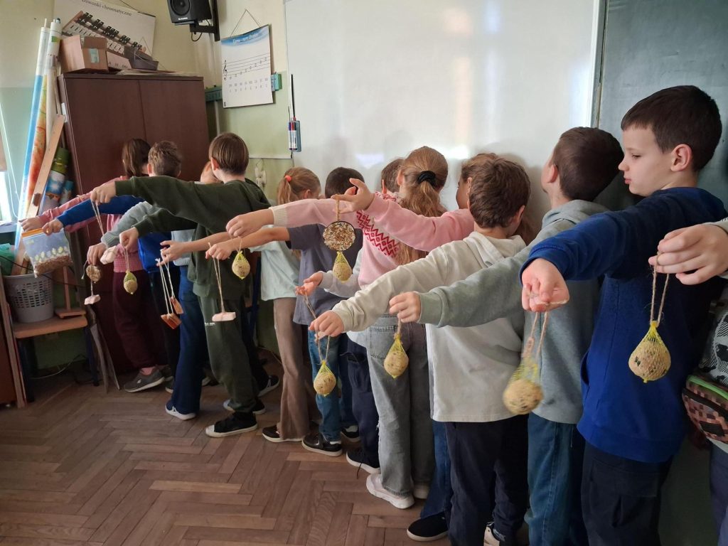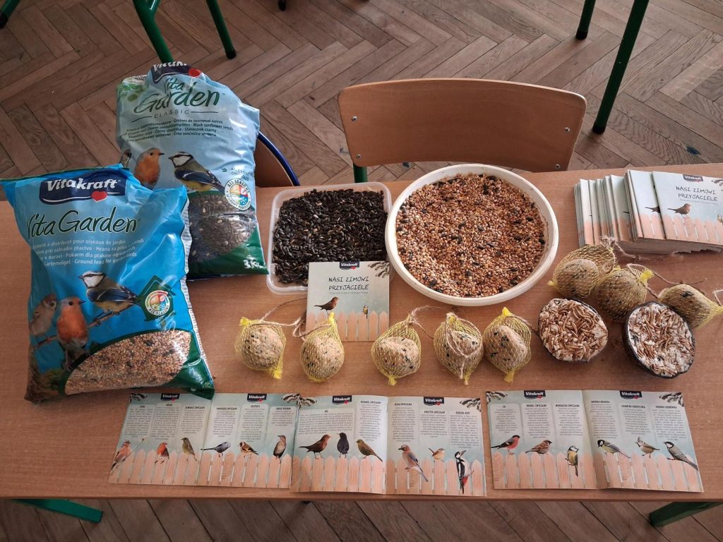 Przygotowali pokarm dla ptaków, by pomoc im przetrwać mroźną zimę. Nasypali do karmnika ziarna pszenicy, oraz pestki słonecznika i orzechy. Rozwiesili na gałązkach kule z ziarnami oraz słoninkę dla sikorek. Uczniowie rozróżniali gatunki ptaków np. kosa, wróbla, sikorkę, gila, mazurka i kawkę. Uczniowie klasy 7b otrzymali od młodszych uczniów książeczki o ptakach.