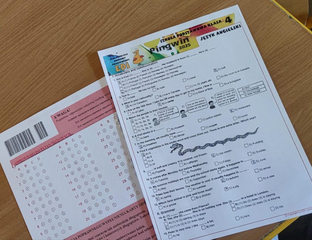 W celu urozmaicenia programu zajęć i zachęcenia uczniów do rozwijania swoich umiejętności, 19 listopada odbył się w naszej szkole ogólnopolski konkurs przedmiotowy Pingwin z języka angielskiego i niemieckiego. Konkurs cieszył się dużą popularnością, udział w nim wzięło aż 60 uczniów z klas IV-VIII. Z niecierpliwością czekamy na wyniki konkursu, które zostaną przesłane do szkoły do dnia 16 stycznia 2026 roku i trzymamy kciuki za jak najlepsze wyniki naszych uczniów.