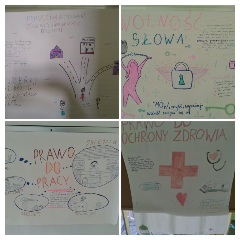 Uczniowie klas 8, na lekcjach WOS-u zapoznali się z historią ustanowienia praw człowieka. Wykonali plakaty, mające na celu rozpropagowanie praw, z których