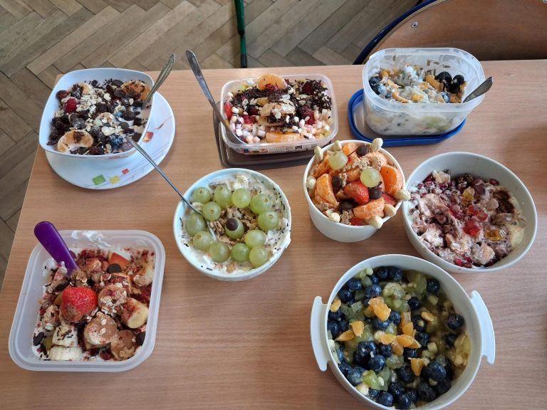 Uczniowie kl.3a byli dziś ,,Mistrzami kuchni”. Założyli fartuszki oraz czapki i rozpoczęli pracę od pokrojenia owoców. Przygotowali zdrowe śniadanie z jogurtu, płatków,