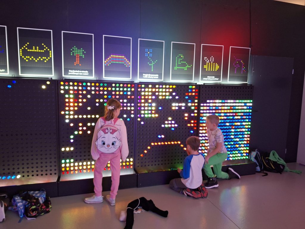 Dzieci z zaangażowaniem wykonywały zadania podczas obu zajęć warsztatowych. Po nich nastąpił czas odkrywania i zwiedzania wystawy kolorów i wystawy światła. Podczas wyjątkowej podróży dzieci doświadczały, poznawały właściwości kolorów i światła. Zanurzały się w świecie 3D i fluorescencji.