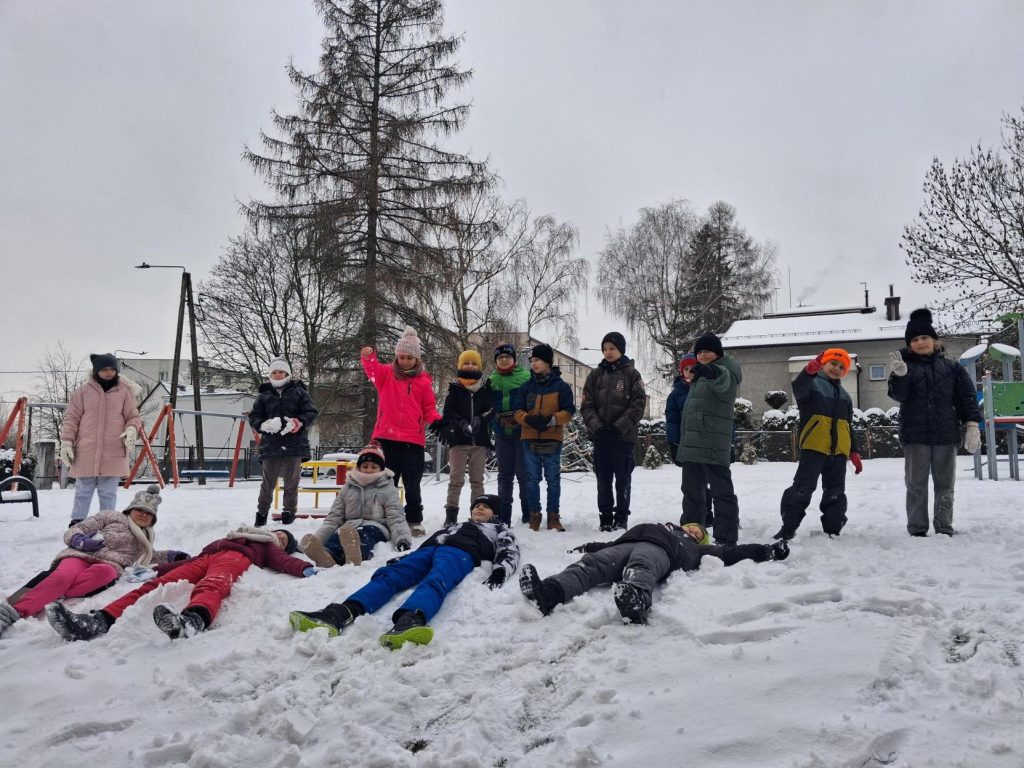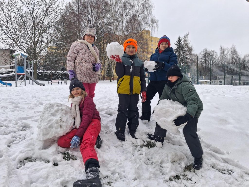 ,,Zimowe szaleństwo”, czyli rzucanie śnieżkami do celu, turlanie się w śniegu, odbijanie ,, aniołków” i wspólne ulepienie bałwana dało dzieciom wiele radości i frajdy.
